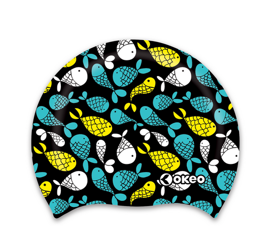 Le bonnet de bain GOLDFISH, en silicone résistant, avec un motif de petits poissons sur fond noir, offre un ajustement ergonomique et réduit la résistance dans l’eau. Idéal pour les nageurs de tous niveaux, il garantit confort et durabilité.