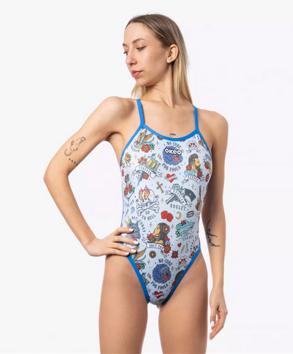 Le maillot de bain une pièce Oscar pour femme, réalisé en tissu X-PLAY, présente un motif old school de tatouages sur fond bleu et de fines bretelles bleues. Doublé et confortable, il offre style et praticité pour toutes les occasions à la piscine.
